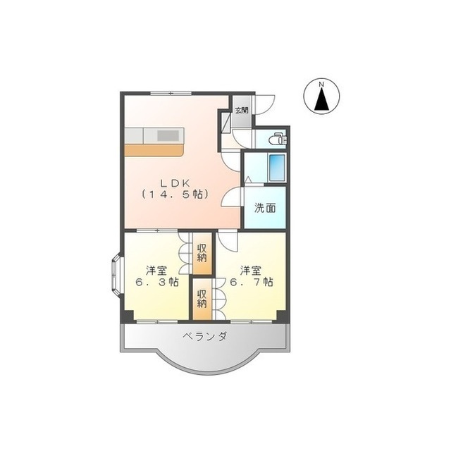 | 間取 | 2LDK ( LDK 14.5帖 / 洋 6.7帖 / 洋 6.3帖 ) |