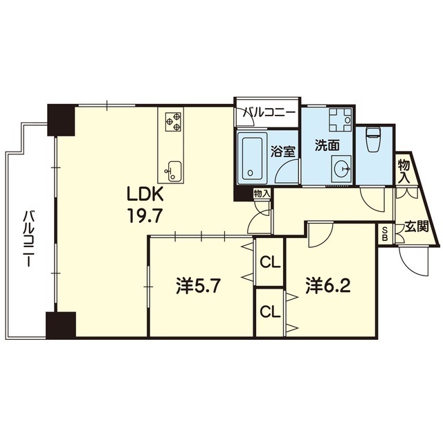 | 間取 | 2LDK ( LDK 19.7帖 / 洋 6.2帖 / 洋 5.7帖 ) |