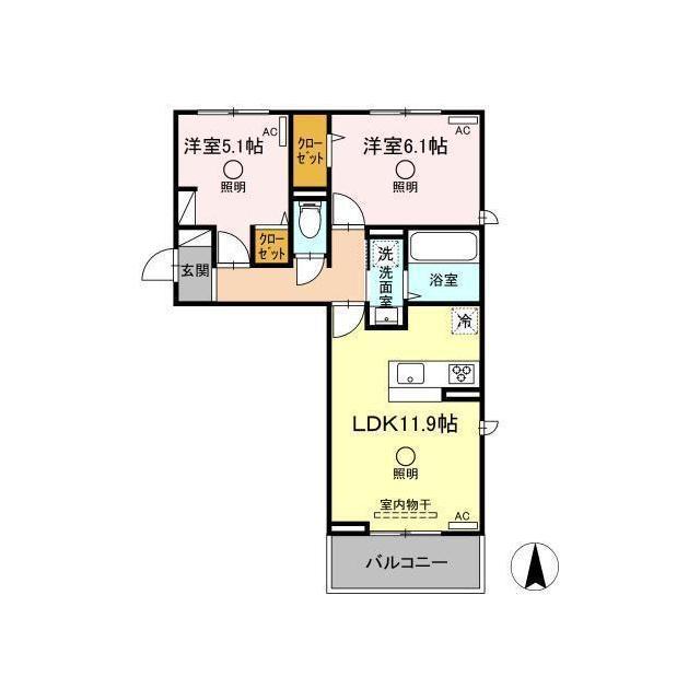 | 間取 | 2LDK ( LDK 11.9帖 / 洋 6.1帖 / 洋 5.1帖 ) |