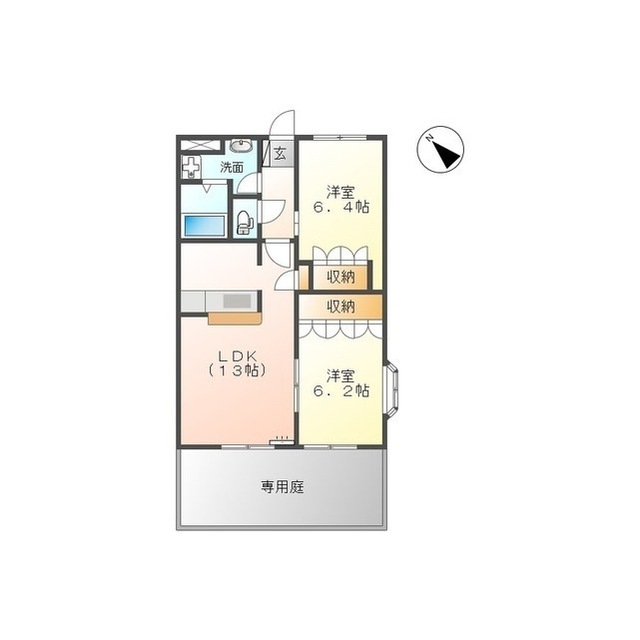 | 間取 | 2LDK ( LDK 13帖 / 洋 6.4帖 / 洋 6.2帖 ) |