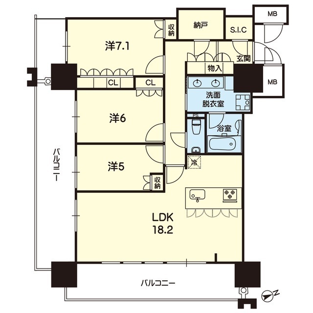 | 間取 | 3SLDK ( LDK 18.2帖 / 洋 7.1帖 / 洋 6帖 / 洋 5帖 ) |