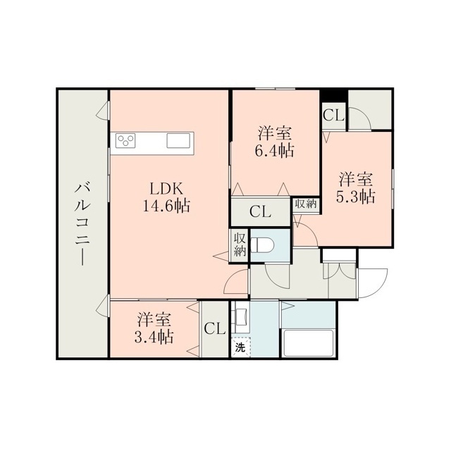 | 間取 | 3LDK ( LDK 14.6帖 / 洋 6.4帖 / 洋 5.3帖 / 洋 3.4帖 ) |