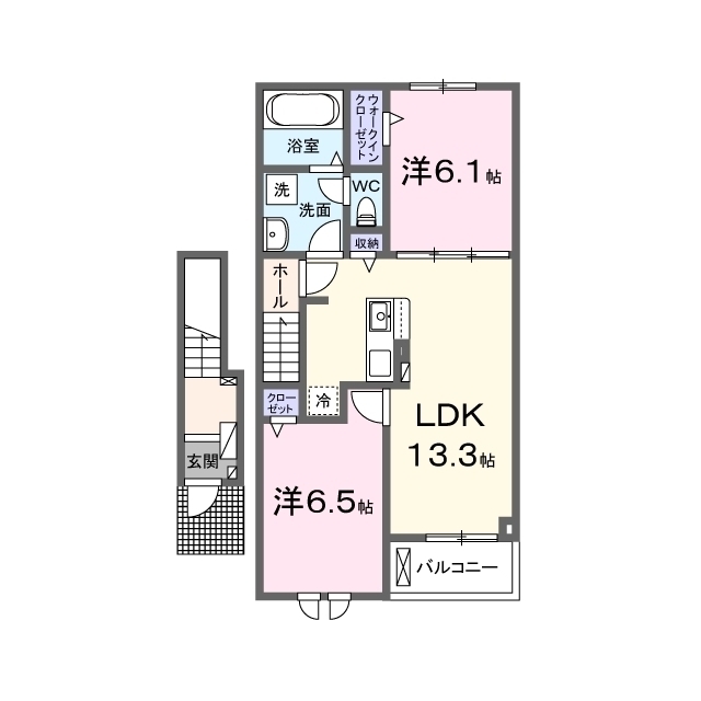 | 間取 | 2LDK ( LDK 13.3帖 / 洋 6.5帖 / 洋 6.1帖 ) |