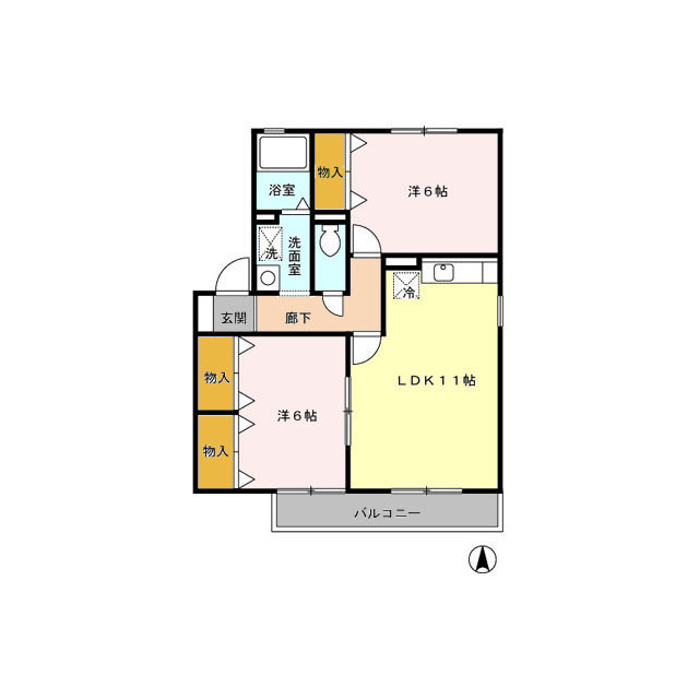 | 間取 | 2LDK ( LDK 11帖 / 洋 6帖 / 洋 6帖 ) |