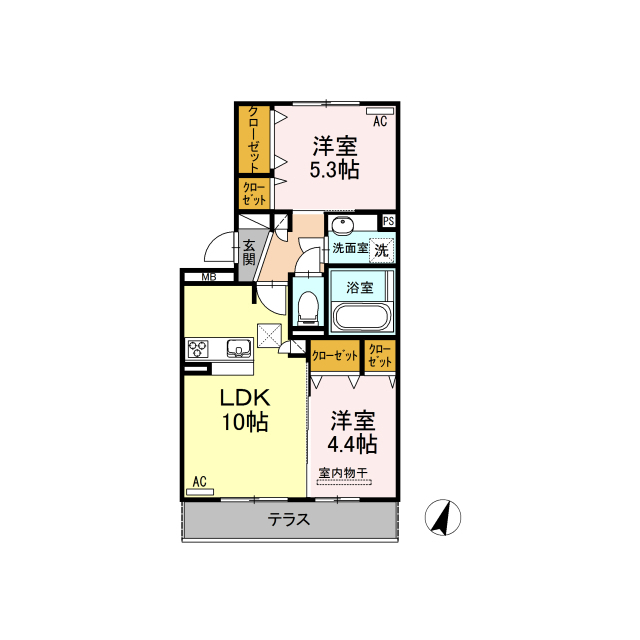 | 間取 | 2LDK ( LDK 10帖 / 洋 5.3帖 / 洋 4.4帖 ) |