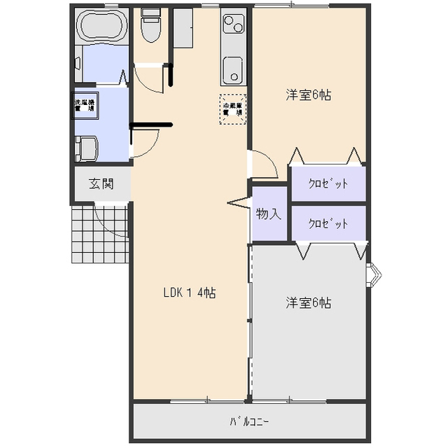 | 間取 | 2LDK ( LDK 14帖 / 洋 6帖 / 洋 6帖 ) |