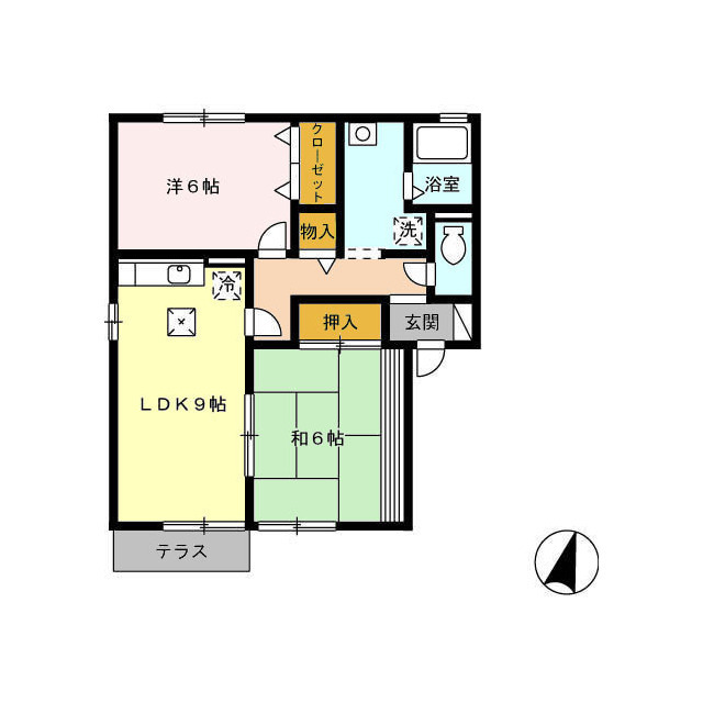 | 間取 | 2DK ( DK 9帖 / 和 6帖 / 洋 6帖 ) |
