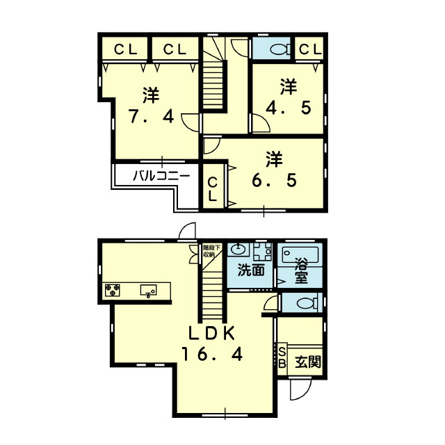 | 間取 | 3LDK ( LDK 16.4帖 / 洋 4.5帖 / 洋 6.5帖 / 洋 7.4帖 ) |