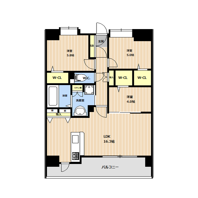 | 間取 | 3LDK ( LDK 16.3帖 / 洋 5.8帖 / 洋 5帖 / 洋 4帖 ) |