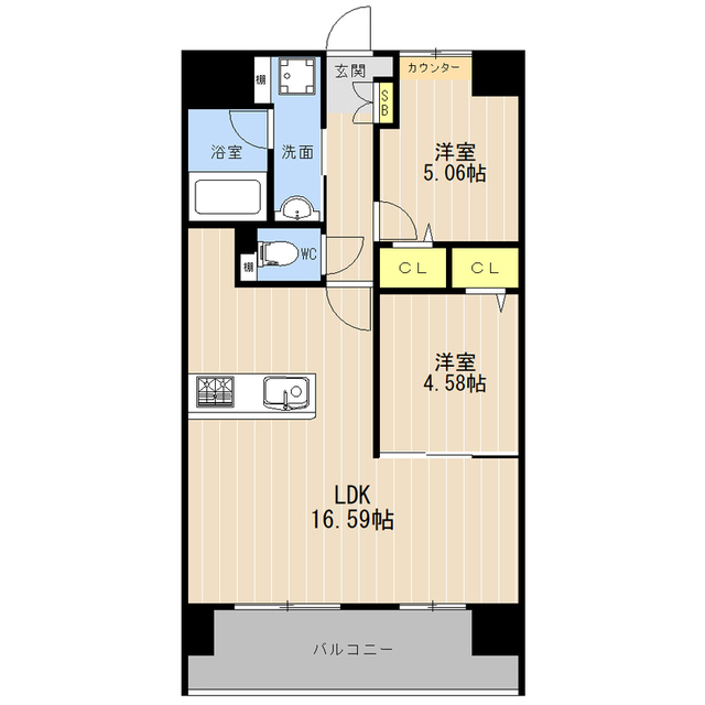 | 間取 | 2LDK ( LDK 16.59帖 / 洋 5.06帖 / 洋 4.58帖 ) |