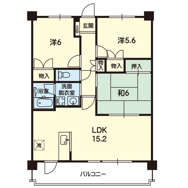 | 間取 | 3LDK ( LDK 15.2帖 / 洋 6帖 / 和 6帖 / 洋 5.6帖 ) |