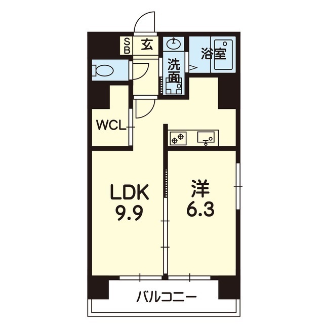 | 間取 | 1LDK ( LDK 9.9帖 / 洋 6.3帖 ) |