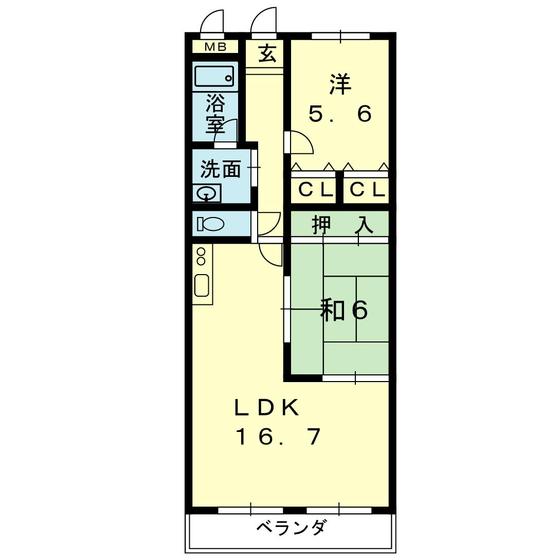 | 間取 | 2LDK ( LDK 16.7帖 / 洋 5.6帖 / 和 6帖 ) |