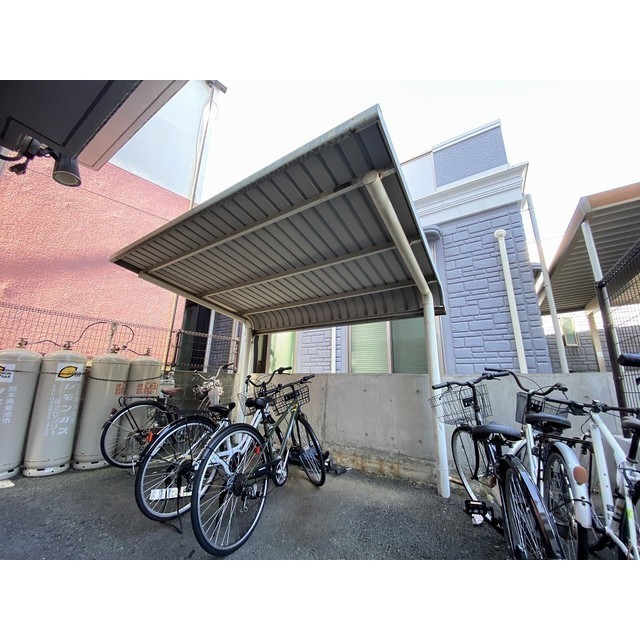 敷地内ゴミ置き場 / 宅配ボックス / 駐輪場 / LPガス / 水道(私営) / 排水(公共下水) / 防犯カメラ / メールBOX(ダイヤル式) / ペット可 / CATV / 地上デジタル / インターネット無料 / 一部屋根付駐車場 / コンクリート舗装 / 給湯(LPガス) / シャワー / 冷暖房 / インターホン(TV) / 室内洗濯置場 / フローリング / ロフト / 電話設置可 / バルコニー / 専用台所 / ガスコンロ / 専用浴室(トイレ別) / 専用トイレ(水洗) / 洗面(浴室と一緒) / クローゼット / シューズボックス / ウォシュレット / 2口ガスコンロ / 角部屋 / ペット可