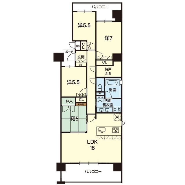 | 間取 | 4LDK ( LDK 18帖 / 洋 5.5帖 / 洋 7帖 / 洋 5.5帖 / 和 5帖 ) |