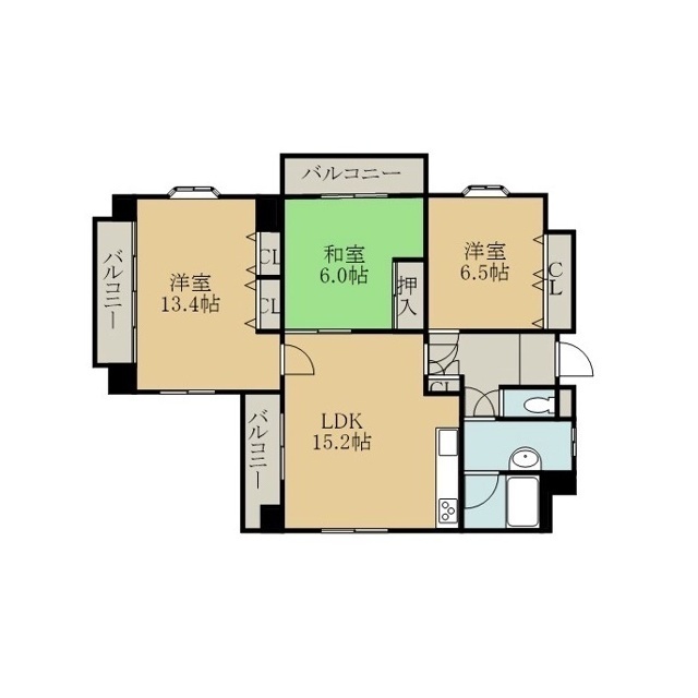 | 間取 | 3LDK ( LDK 15.2帖 / 洋 13.4帖 / 洋 6.5帖 / 和 6帖 ) |