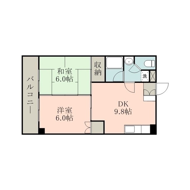 | 間取 | 2DK ( DK 9.8帖 / 洋 6帖 / 和 6帖 ) |