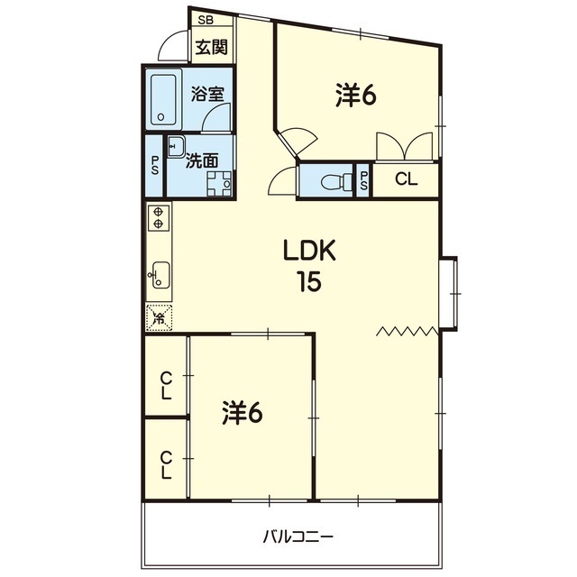 | 間取 | 2LDK ( LDK 15帖 / 洋 6帖 / 洋 6帖 ) |