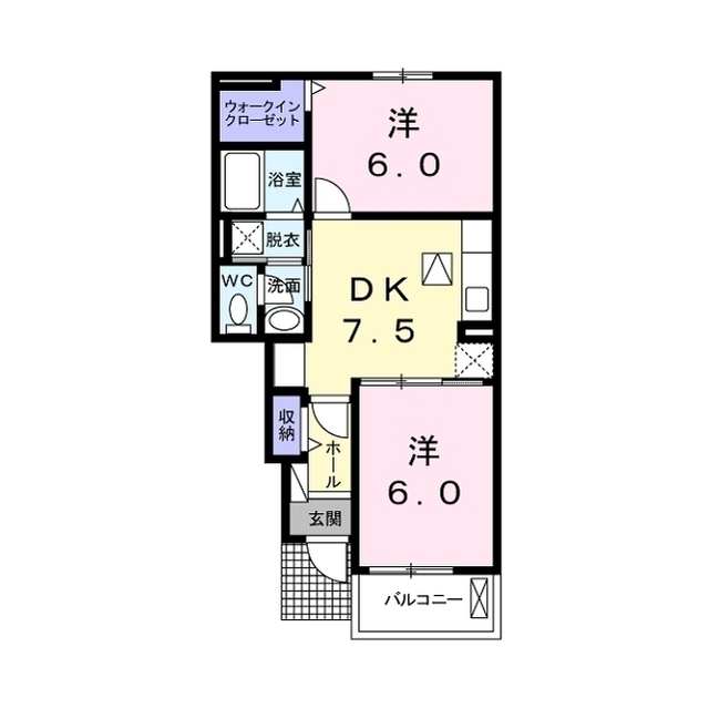 | 間取 | 2DK ( DK 7.5帖 / 洋 6帖 / 洋 6帖 ) |