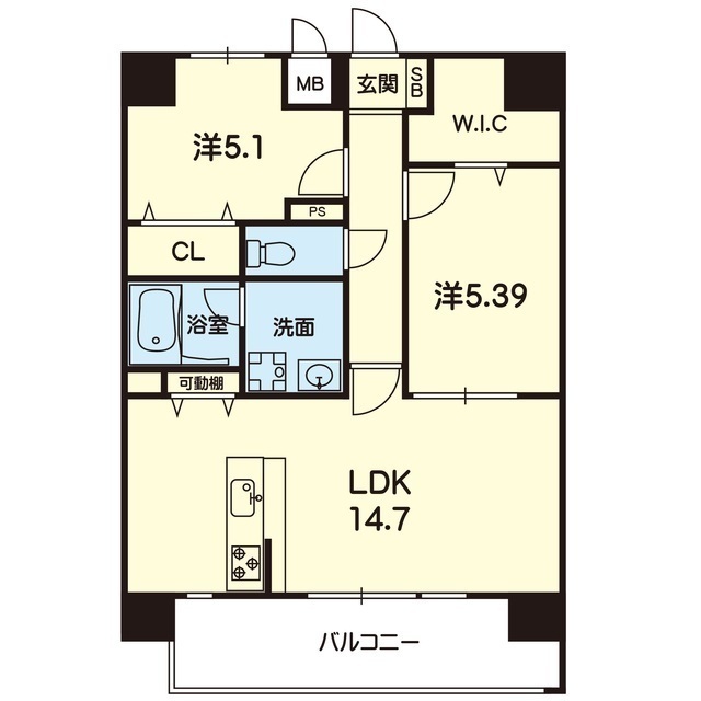 間取 | 2LDK ( LDK 14.7帖 / 洋 5.39帖 / 洋 5.1帖 ) |