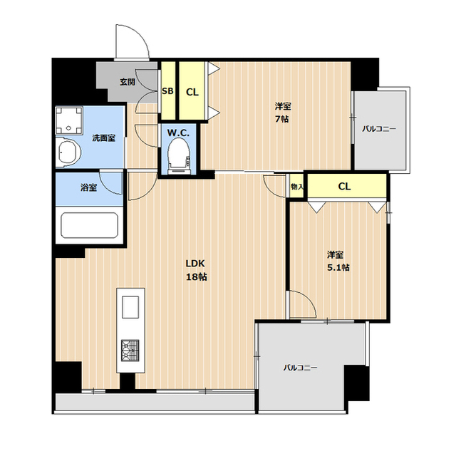| 間取 | 2LDK ( LDK 18帖 / 洋 7帖 / 洋 5.1帖 ) |