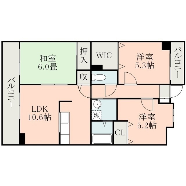 | 間取 | 3LDK ( LDK 10.6帖 / 和 6帖 / 洋 5.3帖 / 洋 5.2帖 ) |