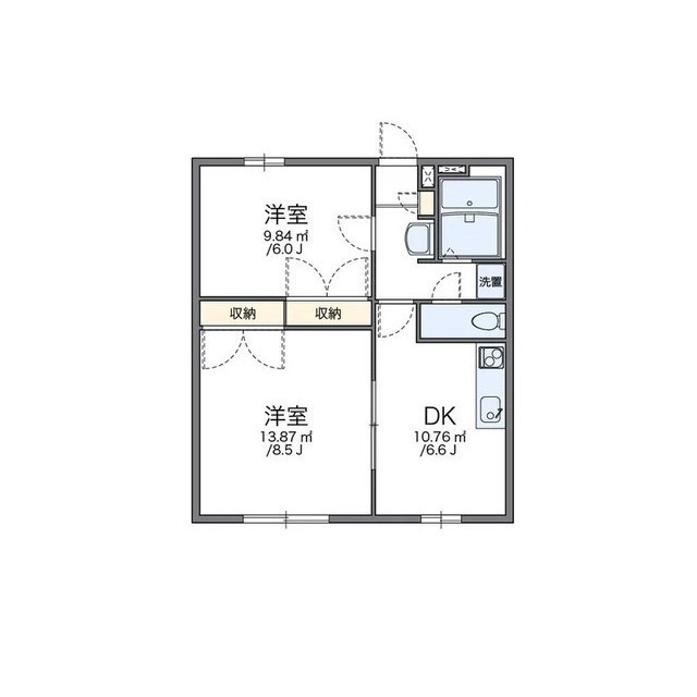 | 間取 | 2DK ( DK 6.6帖 / 洋 8.5帖 / 洋 6帖 ) |