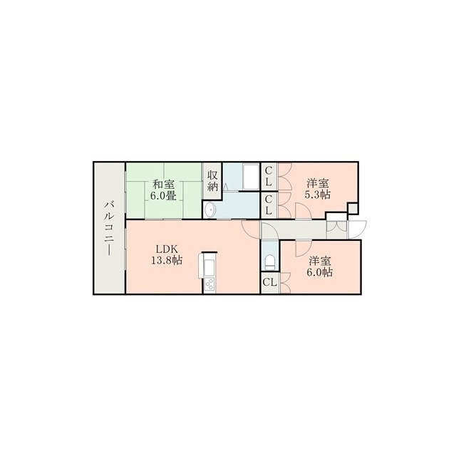 | 間取 | 3LDK ( LDK 13.8帖 / 和 6帖 / 洋 6帖 / 洋 5.3帖 ) |