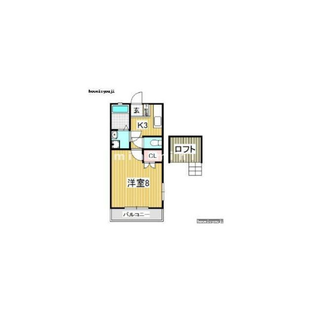 | 間取 | 1K ( K 3帖 / 洋 8帖 ) |