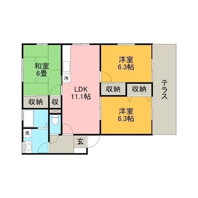 | 間取 | 3LDK ( LDK 11.1帖 / 洋 6.3帖 / 洋 6.3帖 / 和 6帖 ) |