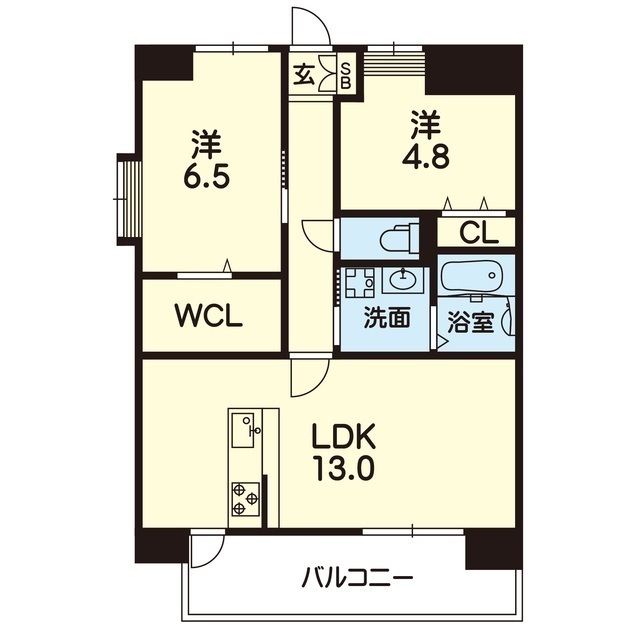 | 間取 | 2LDK ( LDK 13帖 / 洋 6.5帖 / 洋 4.8帖 ) |