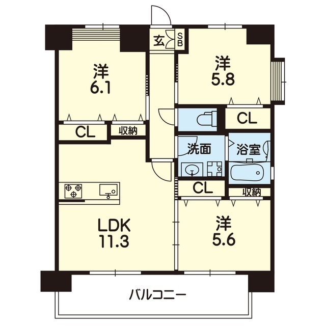 | 間取 | 3LDK ( LDK 11.3帖 / 洋 6.1帖 / 洋 5.8帖 / 洋 5.6帖 ) |