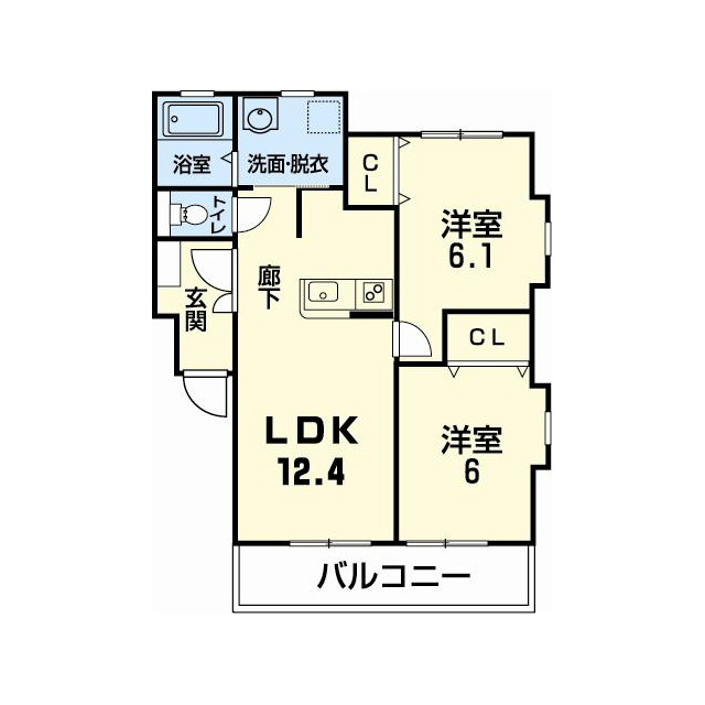 | 間取 | 2LDK ( LDK 12.4帖 / 洋 6帖 / 洋 6.1帖 ) |