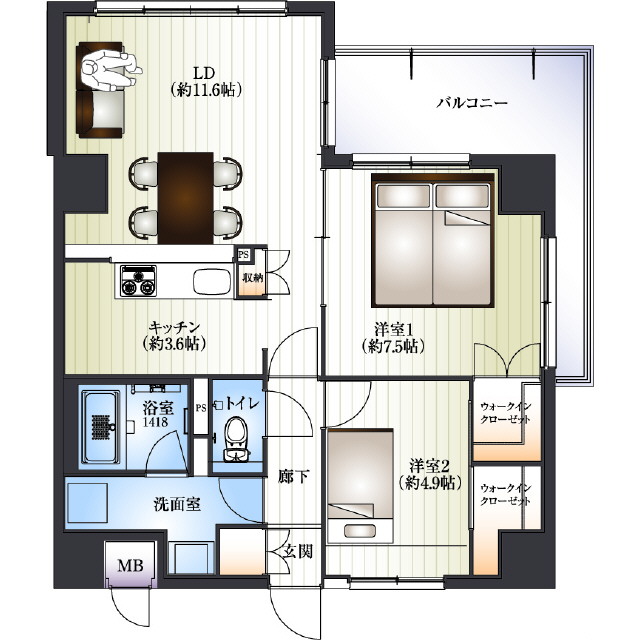 | 間取 | 2LDK ( LDK 15.2帖 / 洋 7.5帖 / 洋 4.9帖 ) |
