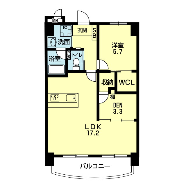 | 間取 | 2LDK ( LDK 17.2帖 / 洋 5.7帖 / DEN 3.3帖 ) |
