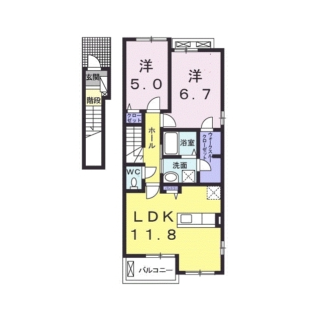 間取 | 2LDK ( LDK 11.8帖 / 洋 6.7帖 / 洋 5帖 ) |