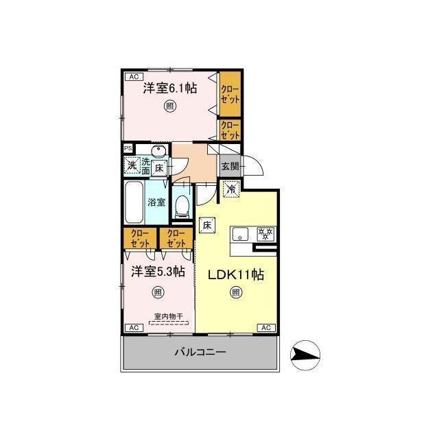 | 間取 | 2LDK ( LDK 11帖 / 洋 6.1帖 / 洋 5.3帖 ) |