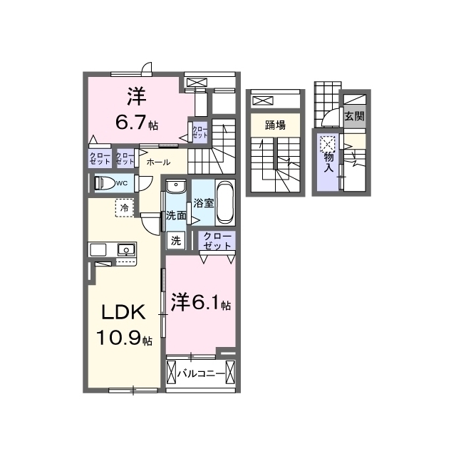 | 間取 | 2LDK ( LDK 10.9帖 / 洋 6.7帖 / 洋 6.1帖 ) |