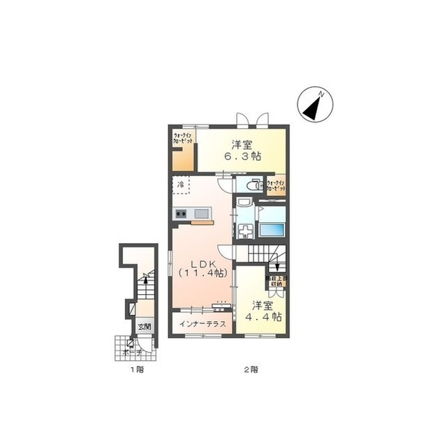 | 間取 | 2LDK ( LDK 11.4帖 / 洋 6.3帖 / 洋 4.4帖 ) |