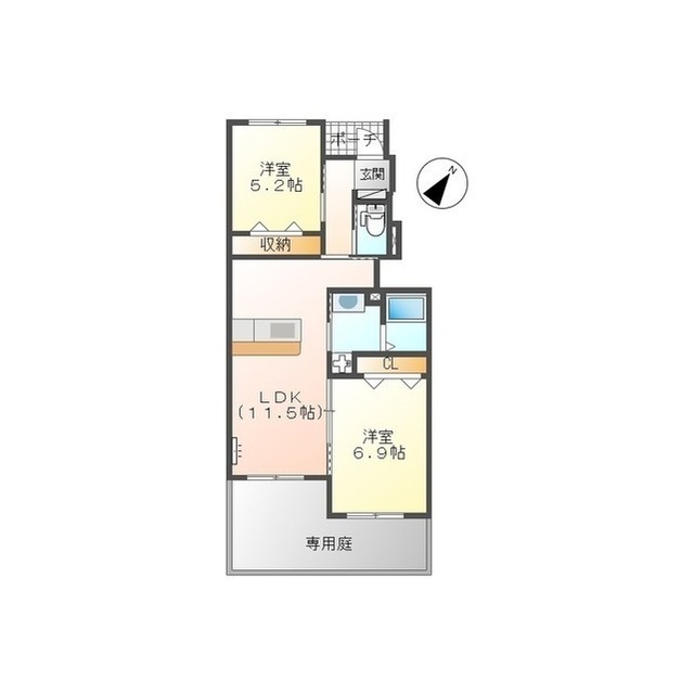 | 間取 | 2LDK ( LDK 11.5帖 / 洋 6.9帖 / 洋 5.2帖 ) |