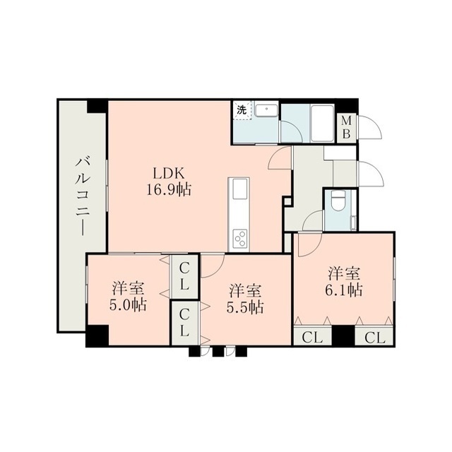 | 間取 | 3LDK ( LDK 16.9帖 / 洋 6.1帖 / 洋 5帖 ) |